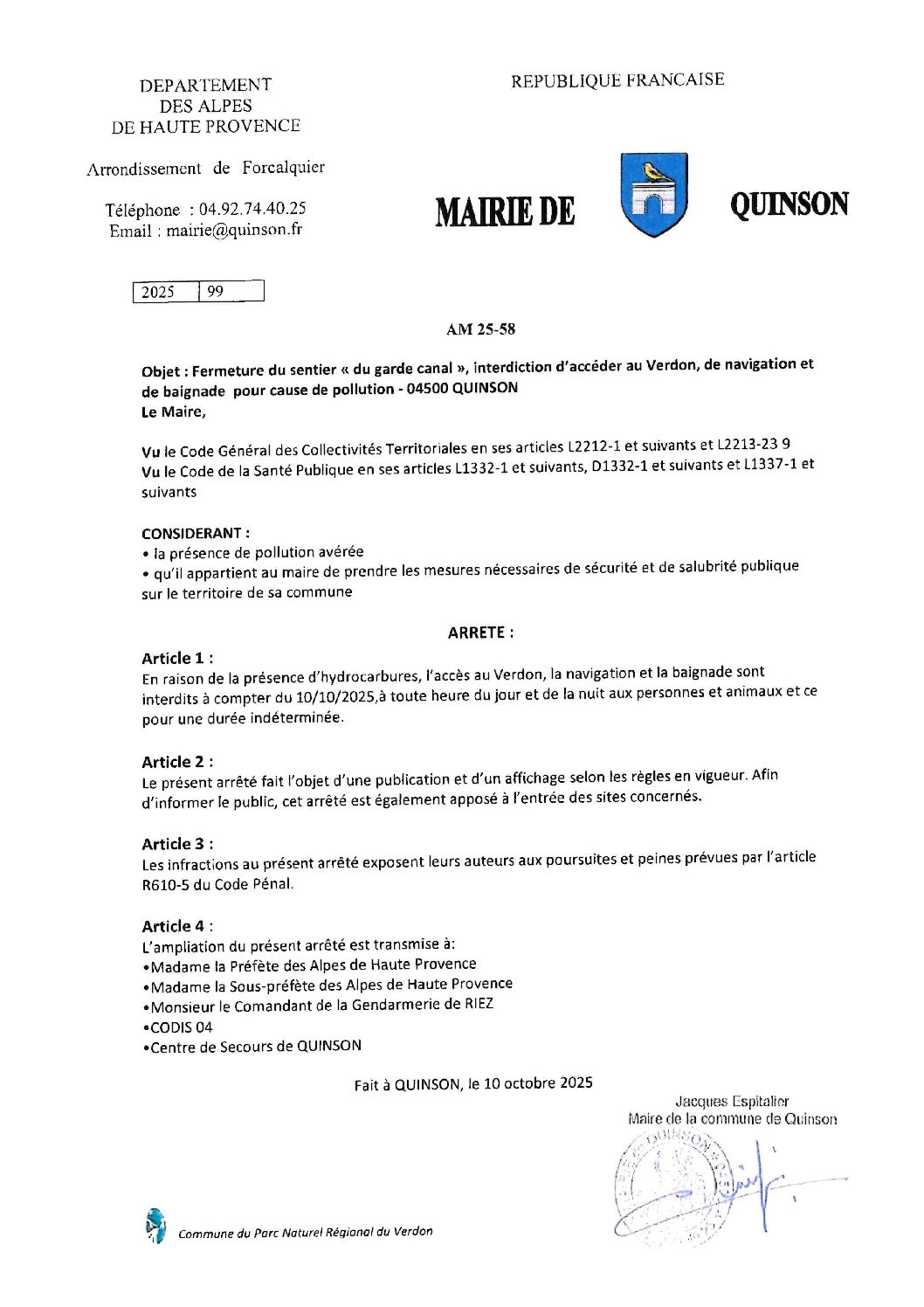 Par arrêté municipal N° AM 25 58, le sentier du garde canal est fermé, l'accès au Verdon, la navigation et la baignade sont interdits , à compter du 10/10/2025, à toute heure du jour et de la nuit, aux personnes et aux animaux, pour une durée indéterminée, pour cause de pollution aux hydrocarbures.