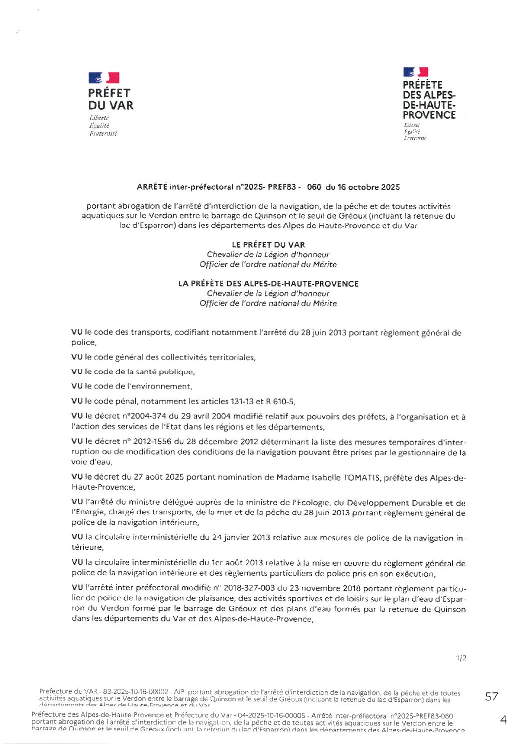 portant abrogation de l'arrêté d'interdiction de la navigation, de la pêche et de toutes activités aquatiques sur le Verdon entre le barrage de Quinson et [...]