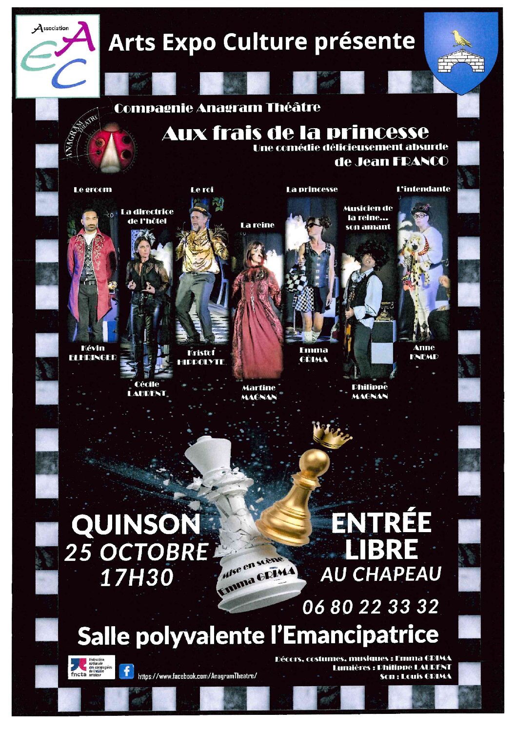 Samedi 25 octobre 2025 17h30 L’Association Arts Expo Culture Vous propose un théâtre "Aux frais de la princesse" avec la compagnie "Anagram théâtre" Salle polyvalente l'Emancipatrice (Entrée gratuite [...]