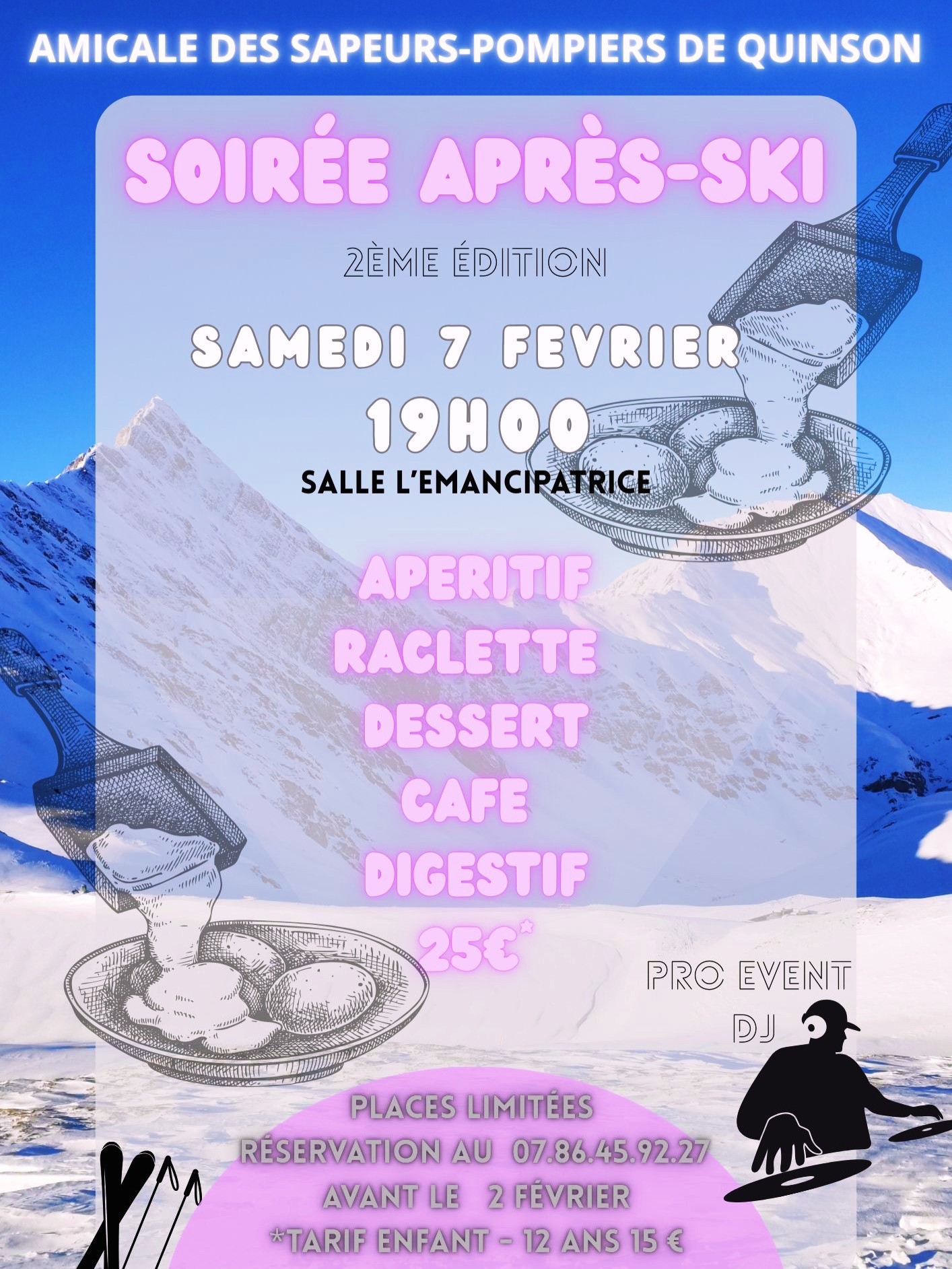 Soirée après-ski 2ème édition SAMEDI 7 FÉVRIER 19h00 SALLE L'EMANCIPATRICE APÉRITIF,RACLETTE, DESSERT,CAFÉ,DIGESTIF 25e Place limitée,réservation au 07 86 45 92 27 tarif enfant - de [...]